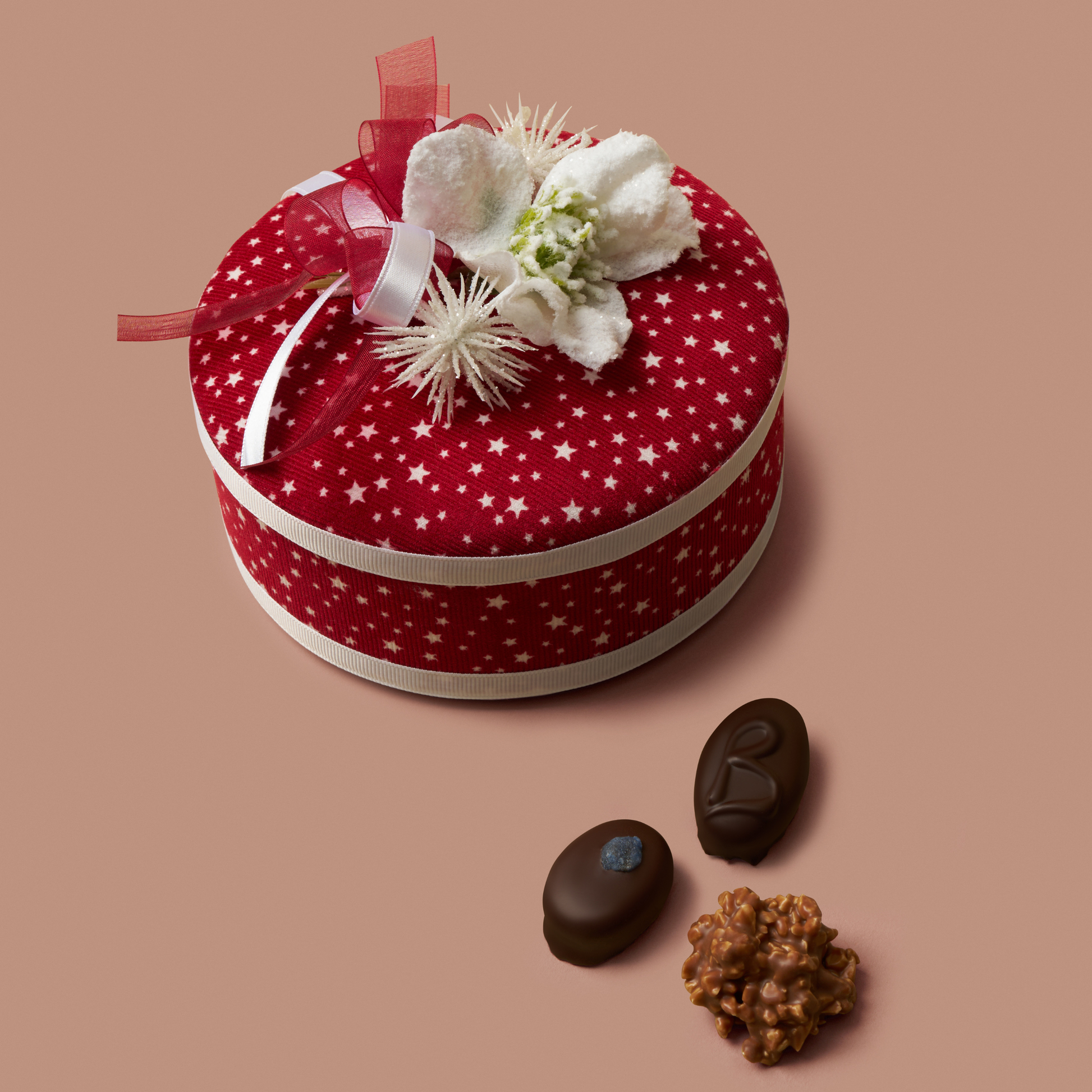 A beautiful assortment of handmade chocolates, packed in a handmade material hat box. The boxes are made in Devon and our chocolates made & packed in Hove. The box includes a selection of milk & dark handmade chocolates including; fondants, caramels, nougats, nuts and marzipans, all enrobed in Valrhona fully traceable milk & dark chocolate.
