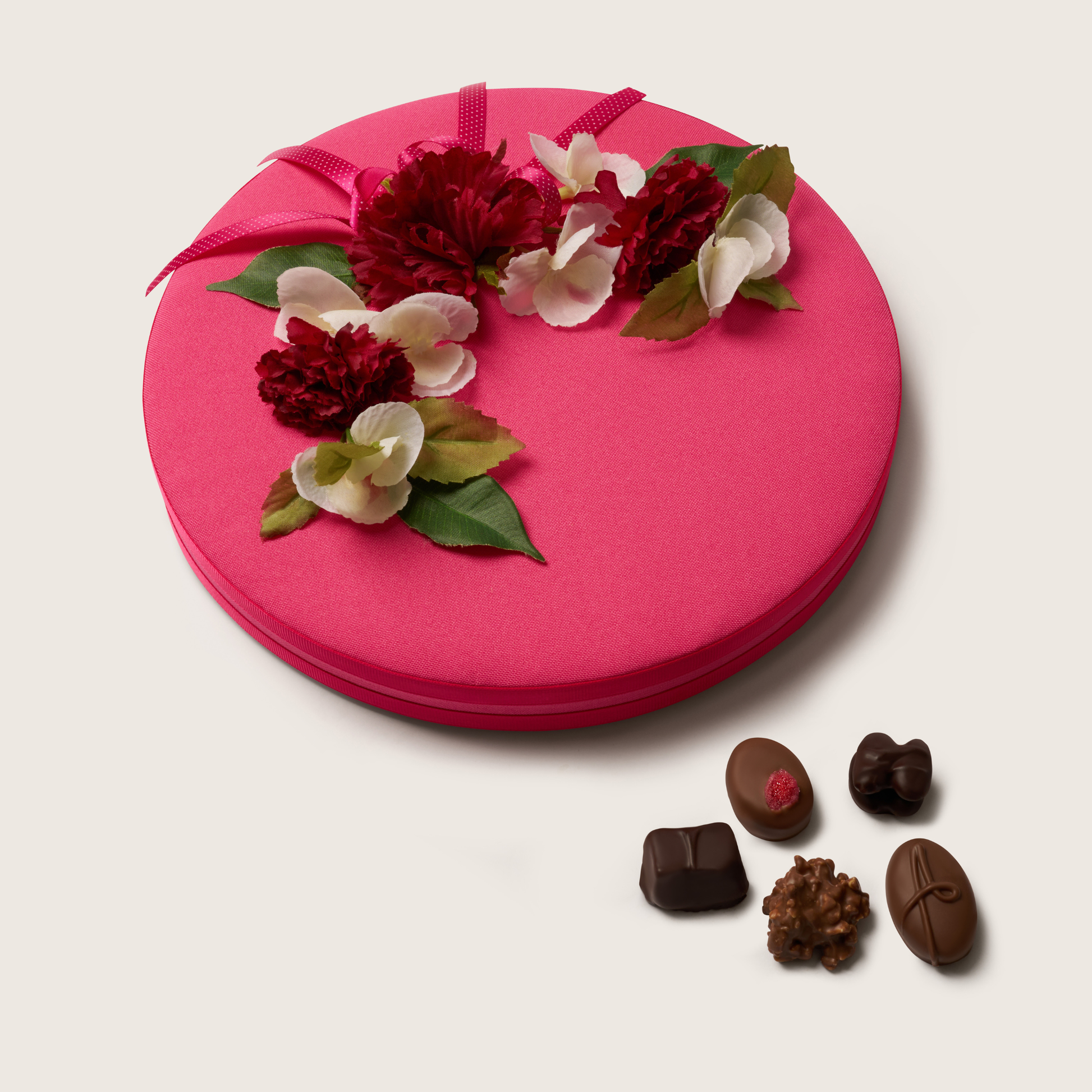 A beautiful assortment of handmade chocolates, presented in a truly one-of-a-kind, handmade fabric hat box. Each box is 100% unique and crafted exclusively for Audrey’s, by hand, in Devon. These special boxes are made entirely in the UK and cannot be found anywhere else.